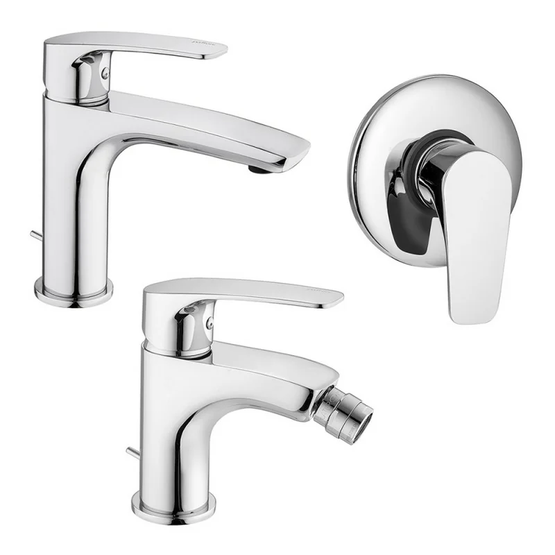 Il set proposto include miscelatore lavabo,bidet e doccia incasso,integralmente progettati in ottone con finitura cromo lucido. I miscelatori lavabo e bidet si presentano completi di sistema di scarico con piletta;il miscelatore doccia è comprensivo di corpo incasso.