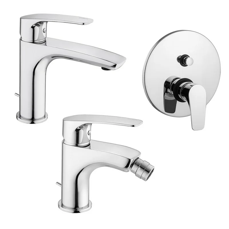 Il set proposto include miscelatore lavabo,bidet e doccia incasso con deviatore,integralmente progettati in ottone con finitura cromo lucido. I miscelatori lavabo e bidet si presentano completi di sistema di scarico con piletta;il miscelatore doccia è comprensivo di corpo incasso.