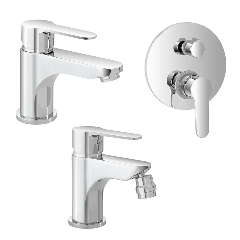 Il set include rubinetto lavabo bidet e doccia incasso con deviatore,realizzati in ottone con finitura cromato lucido. Il miscelatore doccia è completo di copro incasso,lavabo e bidet includono sistema di scarico click-clack per ogni rubinetto.