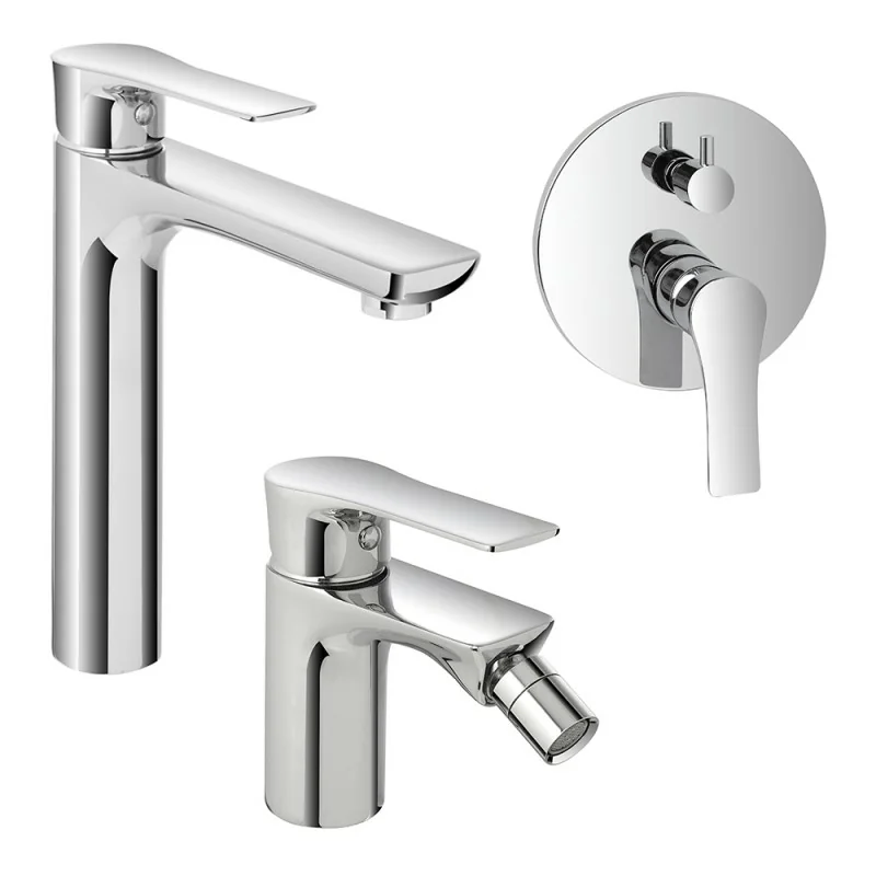 Il set include il miscelatore lavabo alto,bidet e doccia con deviatore integralmente realizzati in ottone,con elegante finitura cromo lucido che permette di abbinarli con facilità al resto della rubinetteria. La confezione lavabo e bidet include piletta click clack con scarico automatico e flessibili di collegamento;il rubinetto doccia è comprensivo di corpo incasso.