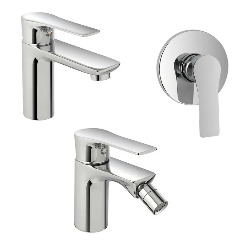Il set include il miscelatore lavabo,bidet e doccia integralmente realizzati in ottone,con elegante finitura cromo lucido che permette di abbinarli con facilità al resto della rubinetteria. La confezione lavabo e bidet include piletta click clack con scarico automatico e flessibili di collegamento;il rubinetto doccia è comprensivo di corpo incasso.
