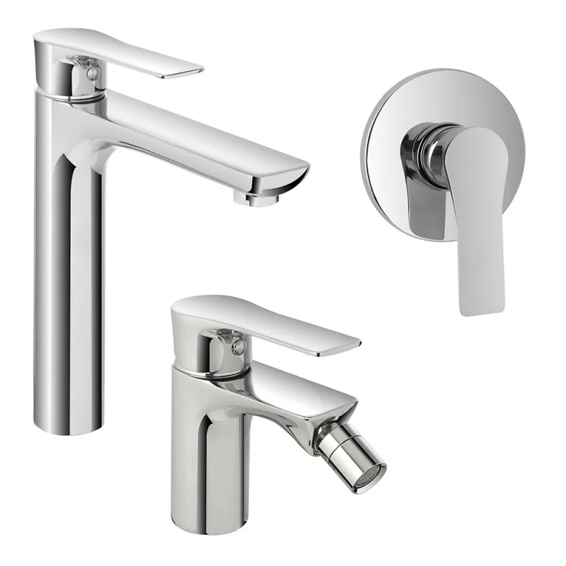 Il set include il miscelatore lavabo alto,bidet e doccia integralmente realizzati in ottone,con elegante finitura cromo lucido che permette di abbinarli con facilità al resto della rubinetteria. La confezione lavabo e bidet include piletta click clack con scarico automatico e flessibili di collegamento;il rubinetto doccia è comprensivo di corpo incasso.