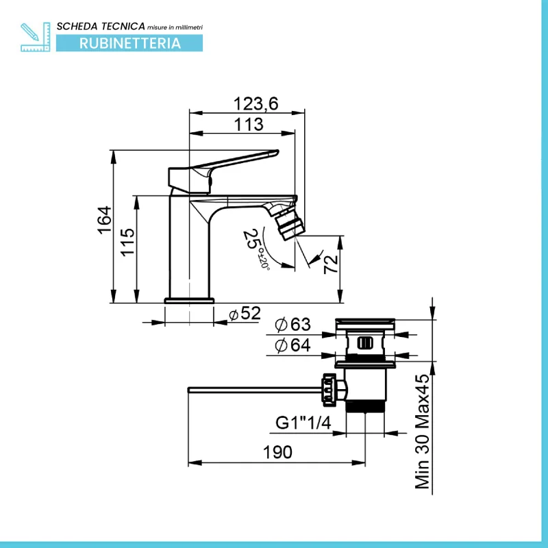 • Piletta di scarico lavabo e bidet da diam. 63cm e attacco standard G1”1/4 inclusa;