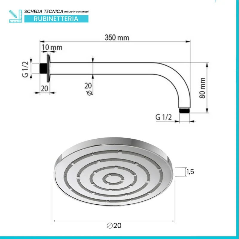 Set doccia con miscelatore braccio 35 cm e soffione 20cm finitura cromo lucido Aurora Scheda tecnica soffione e braccio Aurora Scheda tecnica miscelatore doccia Aurora