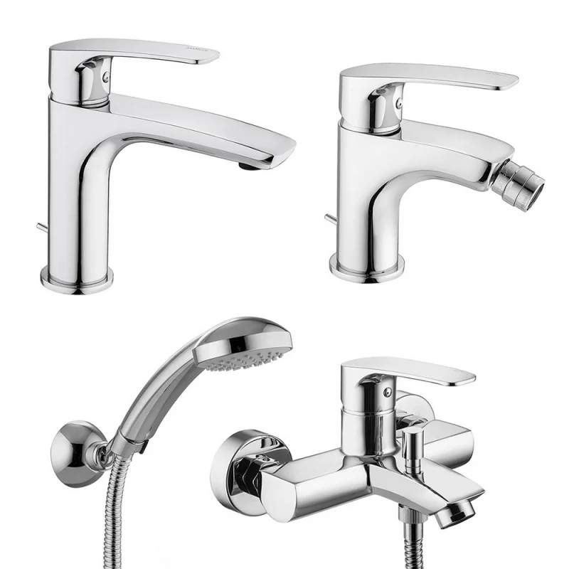 Il set proposto include miscelatore lavabo,bidet e vasca,integralmente progettati in ottone con finitura cromo lucido. I miscelatori lavabo e bidet si presentano completi di sistema di scarico con piletta;il miscelatore vasca è con duplex e kit doccia,laccio da 150 cm,supporto a muro e doccetta.