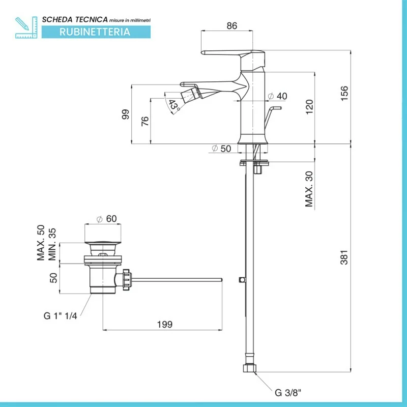 • Dimensioni miscelatore bidet: L 8,6 x P 50 Ø x H 15,6 cm;
