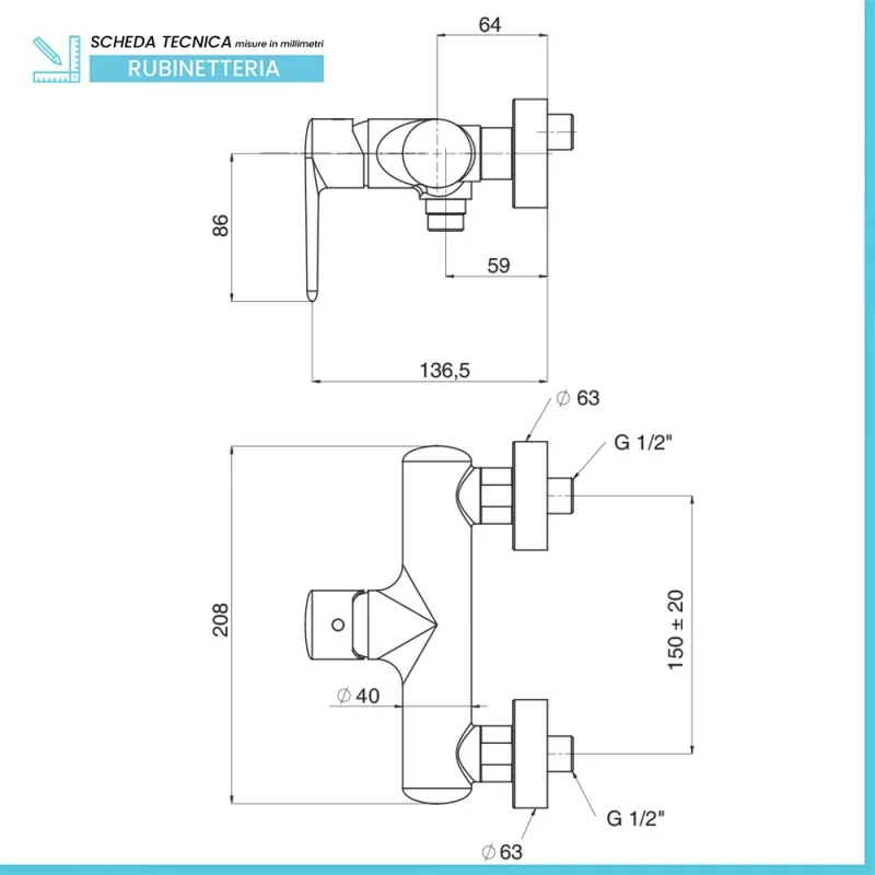 • Dimensioni miscelatore vasca esterno: L 20,8 x P 5,9 x H 8,6 cm: