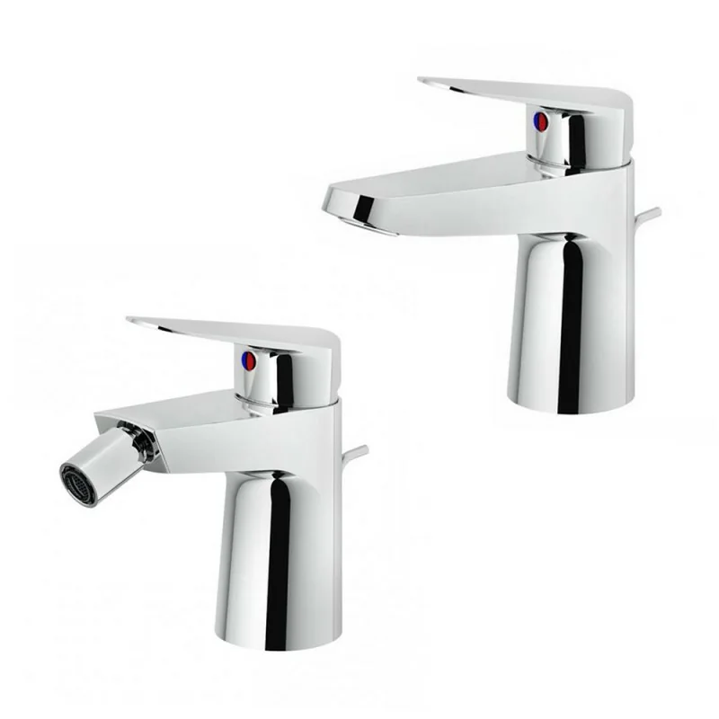 Proponiamo questo set composto da miscelatore lavabo e miscelatore bidet,entrambi realizzati in ottone con finitura cromata e completi di scarico saltarello con piletta inclusa nella confezione.