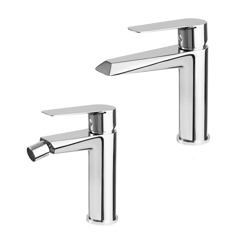 Progettato in ottone con finitura cromo lucido, il set è composto dal miscelatore lavabo e bidet,dotati di sottile leva di comando che garantisce un facile controllo della portata e temperatura dell’acqua.