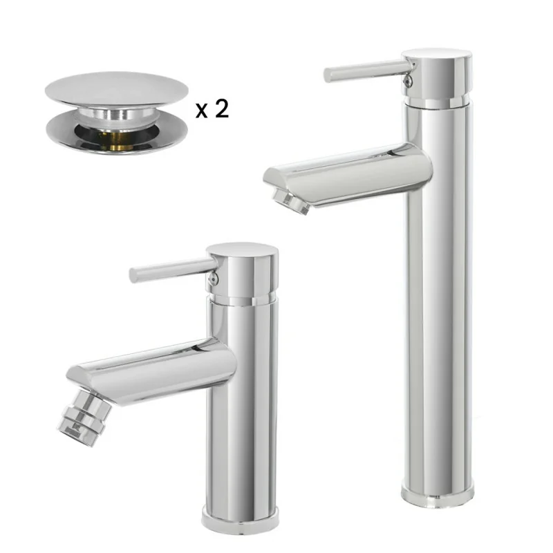 Set miscelatori lavabo alto e bidet – in acciaio inox con finitura cromo lucido,completo di piletta click clack cromata