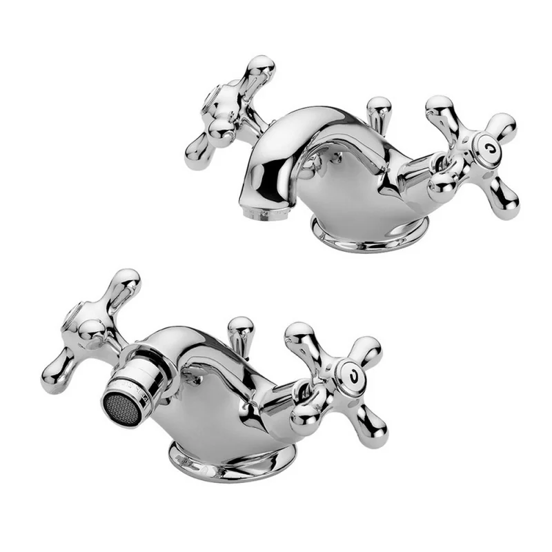 Il set è composto dai miscelatori lavabo e bidet,realizzati in ottone di alta qualità e con finitura cromato lucido in grado di conferire un tocco di lucentezza all’intera sala da bagno;il funzionamento è molto semplice,basta azionare le manopole di comando ai lati del rubinetto.