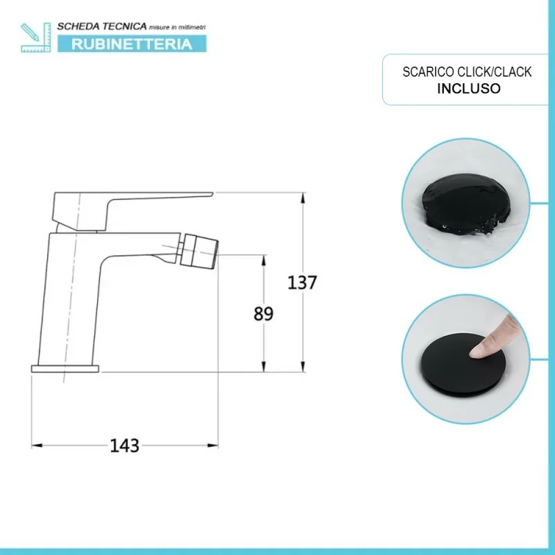 • Dimensioni miscelatore bidet: H 13,7 x p 14,3 cm;