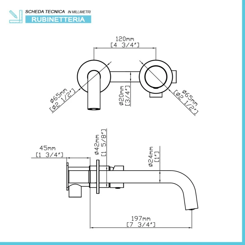 • Dimensioni lavabo a muro: L canna 19,7 cm;