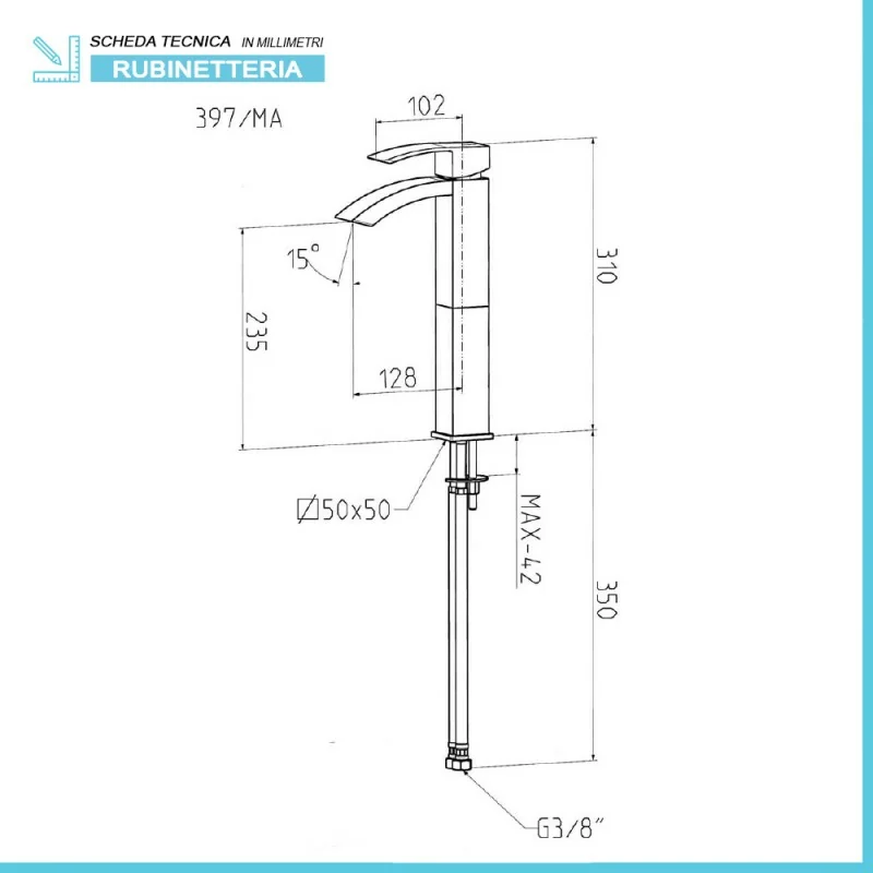 • Dimensioni miscelatore lavabo alto: H 31,1 x P 12,8 cm;