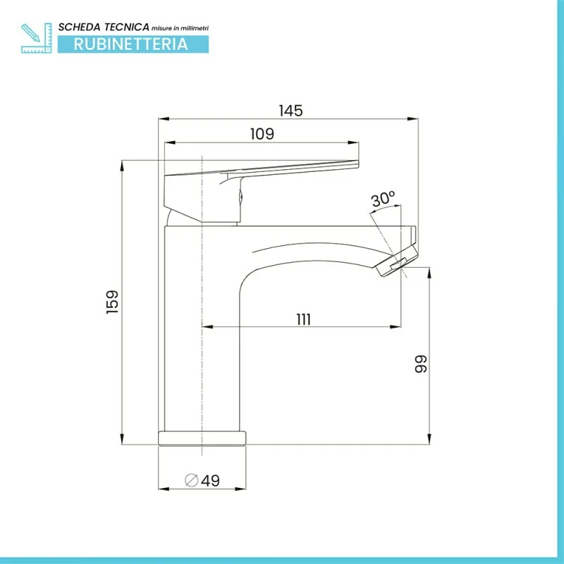 • Dimensioni rubinetto lavabo: L 14,5 x H 15,9 x Diametro 4,9 cm;