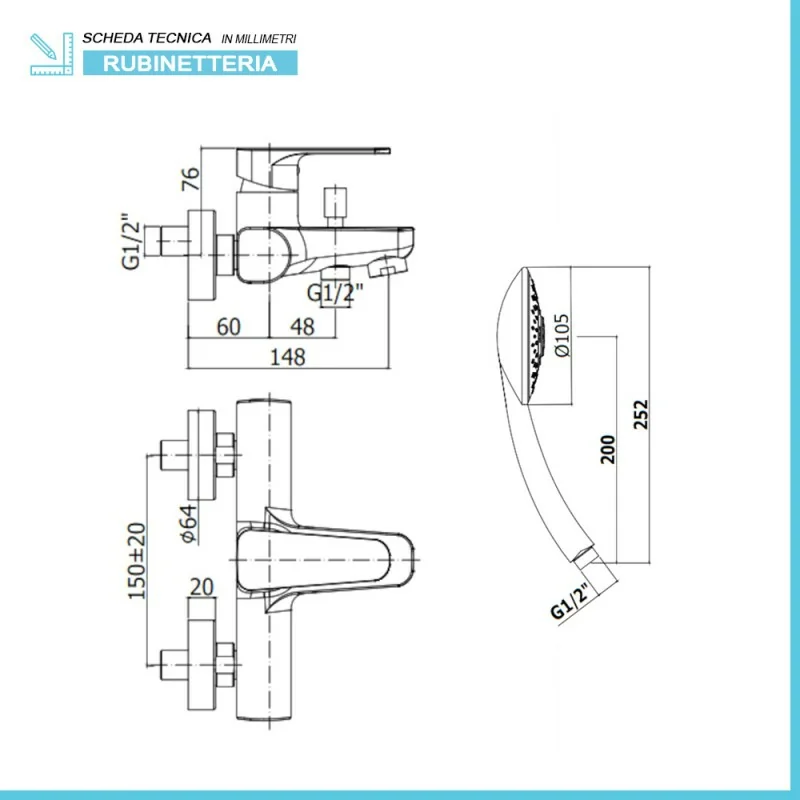 • Tipologia:miscelatore vasca da bagno con doccetta e duplex;