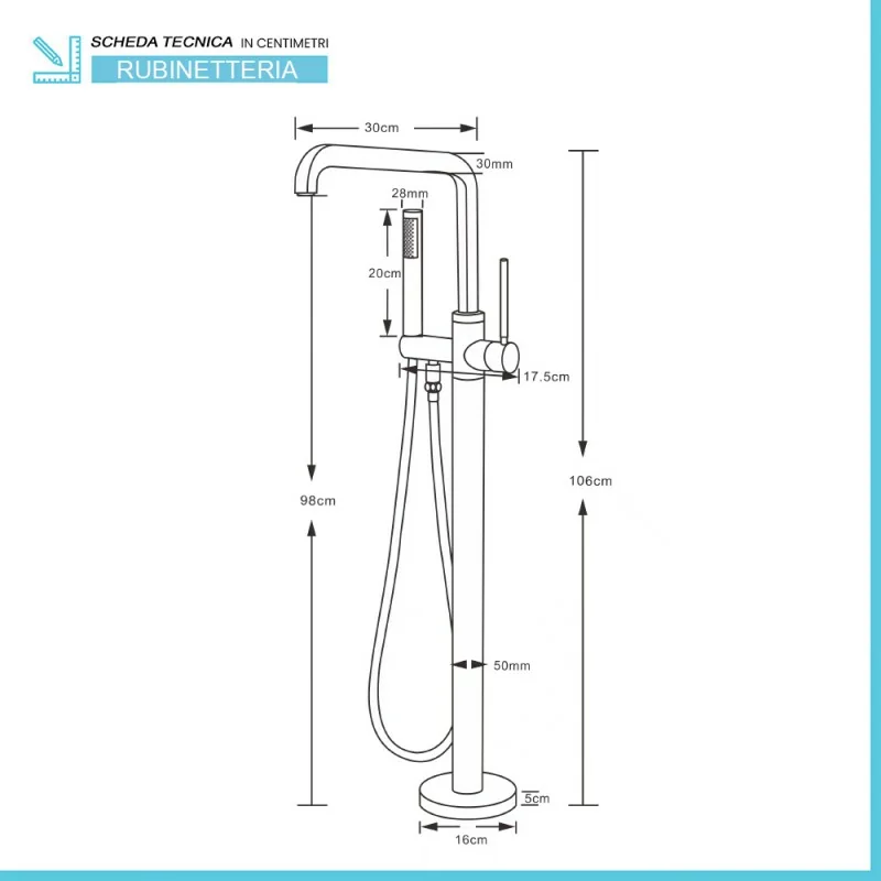 Miscelatore vasca freestanding – colonna da terra in ottone con doccino monogetto e flessibile