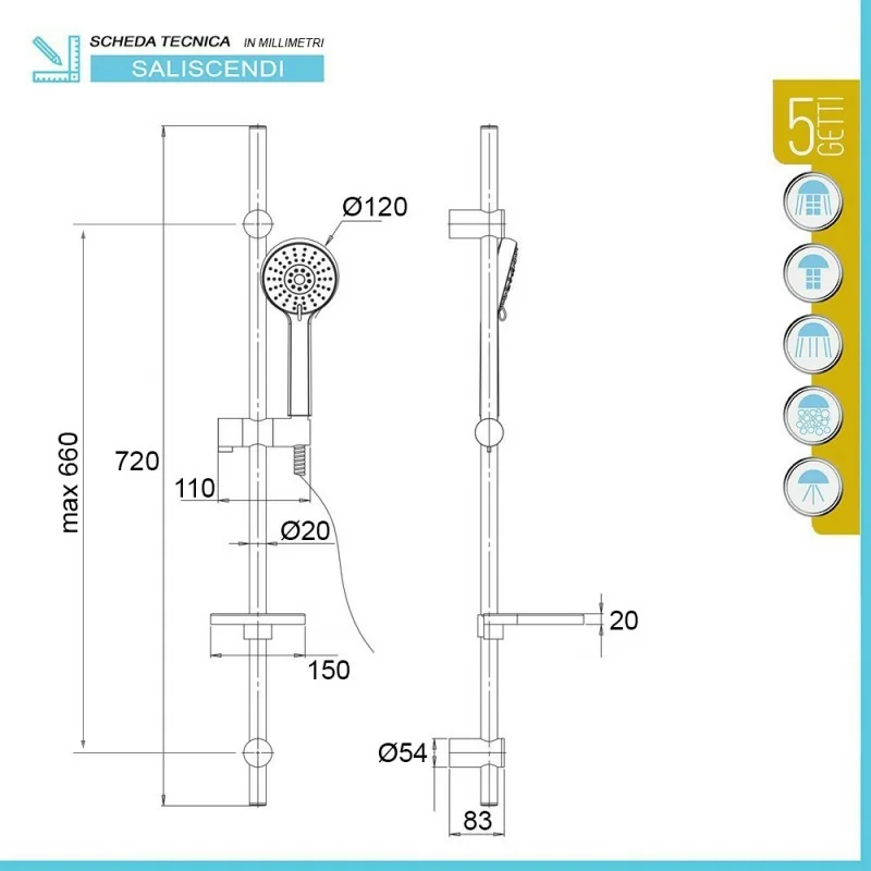 Saliscendi doccia cromato regolabile con doccia 5 funzioni