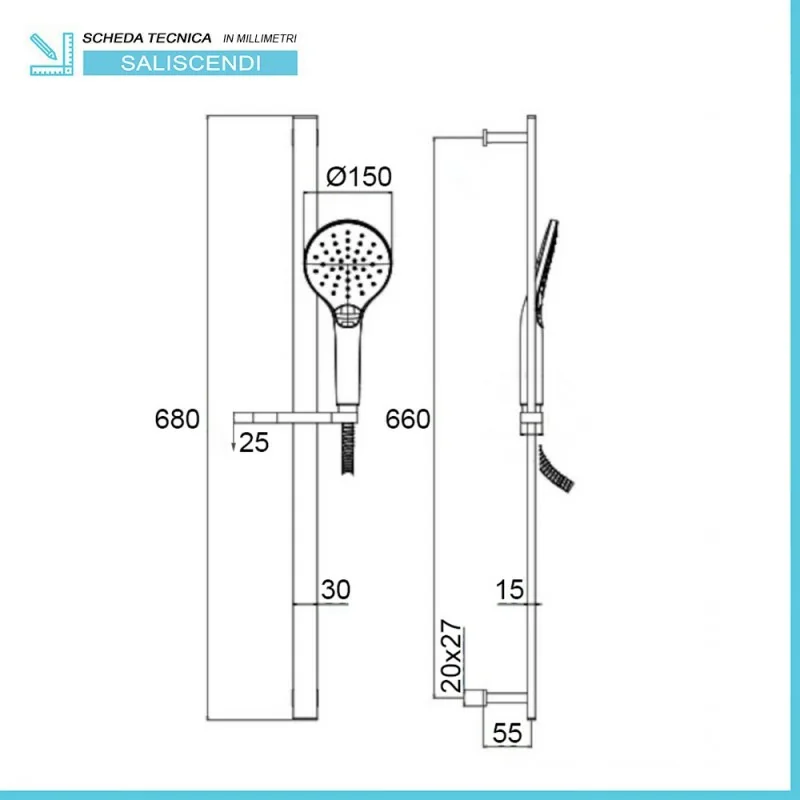 Il saliscendi squadrato è completo di laccio doccia a doppia aggraffatura,doccetta tre funzioni. Potrai completare la zona doccia senza rinunciare ad una scelta pratica e funzionale. Il saliscendi è composto da uno scorrevole meccanico,mentre il flessibile fornito ha una lunghezza di 150 cm.