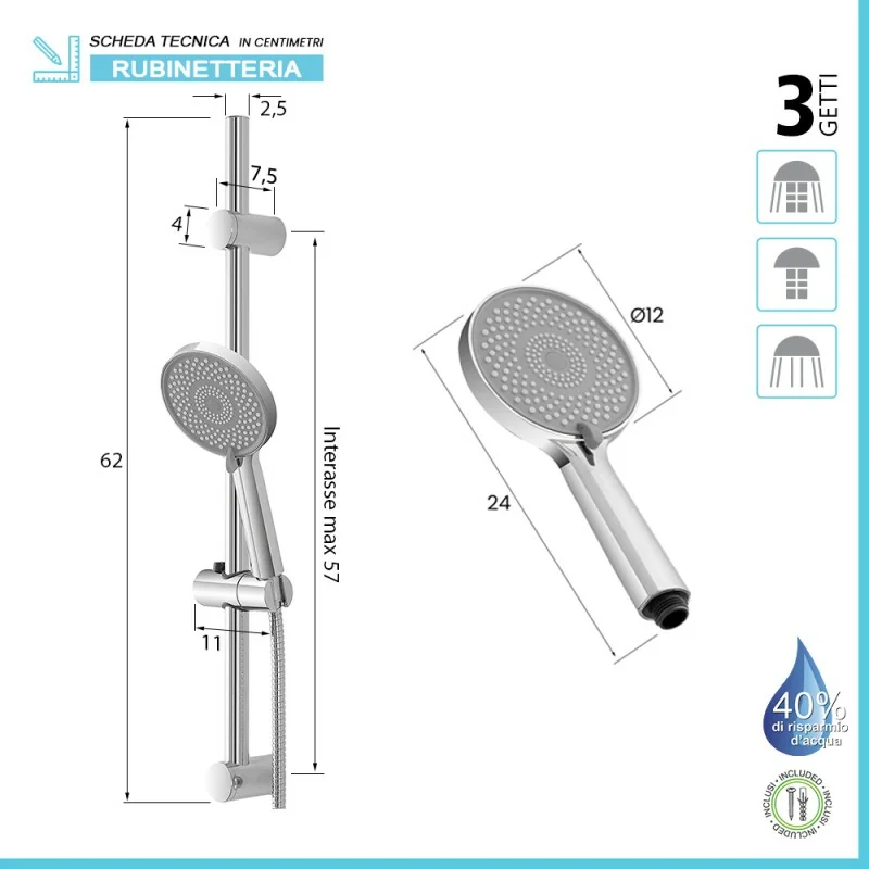 Saliscendi doccia regolabile 60 cm con doccetta a 3 tipi di getto