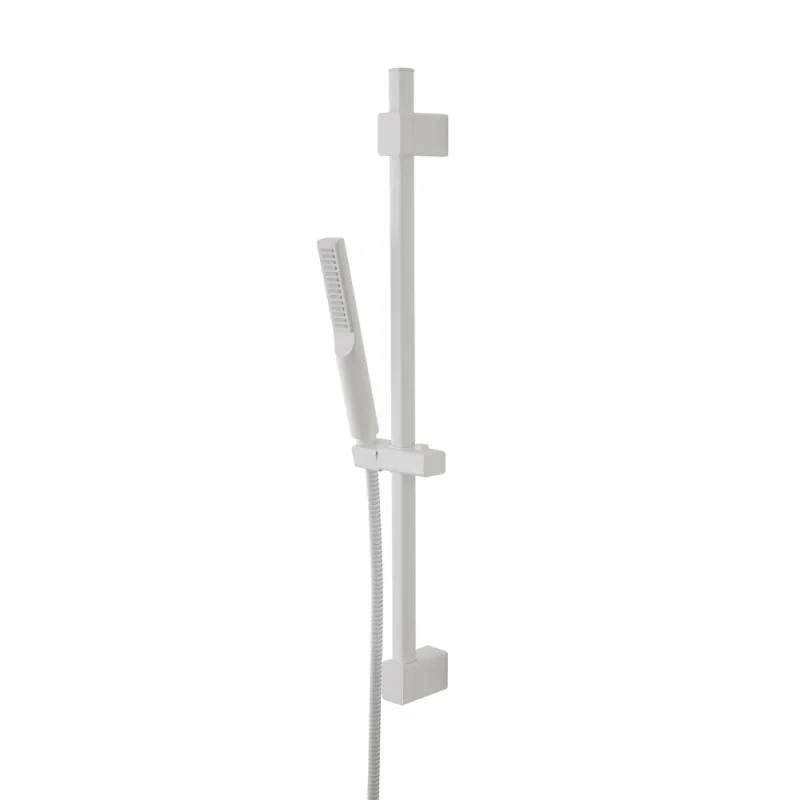 Un'essenziale eleganza che accompagna il tuo rituale di benessere quotidiano. Il saliscendi doccia dal design quadrato, facilmente regolabile con il tasto presente sull’apposito supporto e la sua finitura bianca opaca, è realizzato in ABS garantendo resistenza, leggerezza e rigidità. La doccetta slim monogetto con il flessibile da 150cm dispone di un getto delicato e preciso. Un dettaglio di stile che unisce praticità grazie all’installazione libera con fissaggi inclusi.