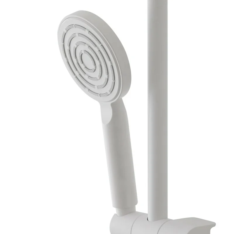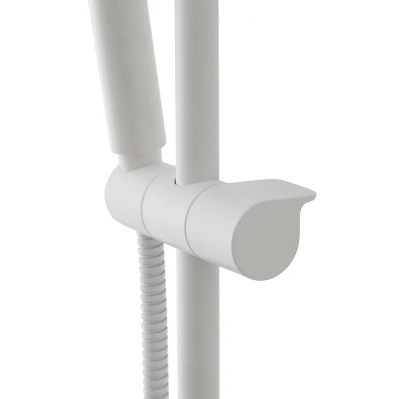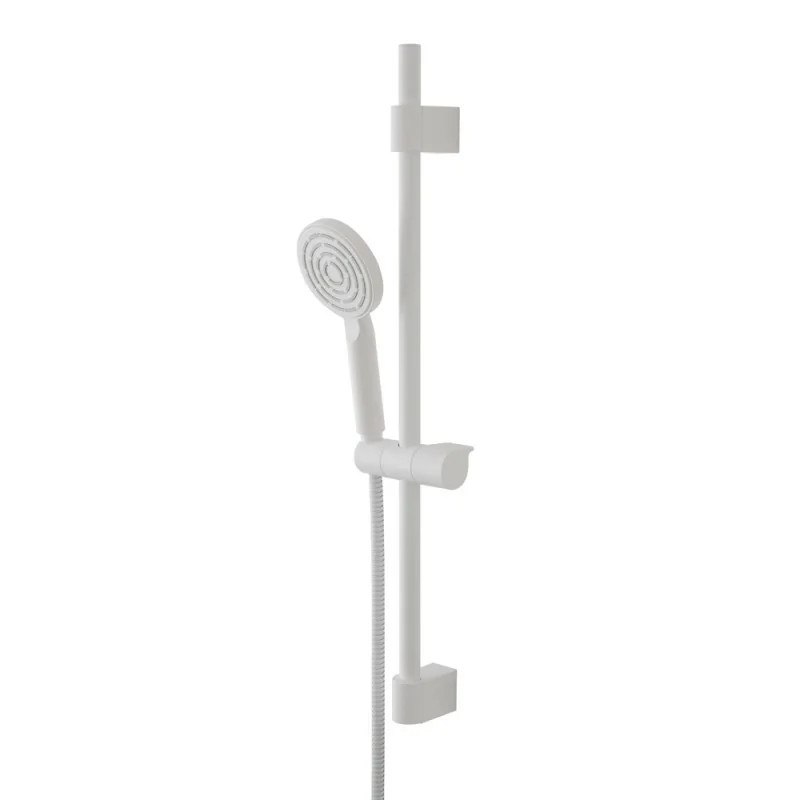 Un'eleganza discreta e contemporanea che definisce la tua zona doccia con carattere. Il saliscendi doccia anticalcare in ABS bianco opaco, dalla forma cilindrica e regolabile grazie alla sua manopola, si unisce alla doccetta monogetto tonda, con un tubo flessibile da 150cm, offrendo un getto d’acqua ampio e confortevole. Un dettaglio di design che promette praticità e un tocco di raffinata modernità al tuo bagno grazie all’installazione libera con fissaggi inclusi.