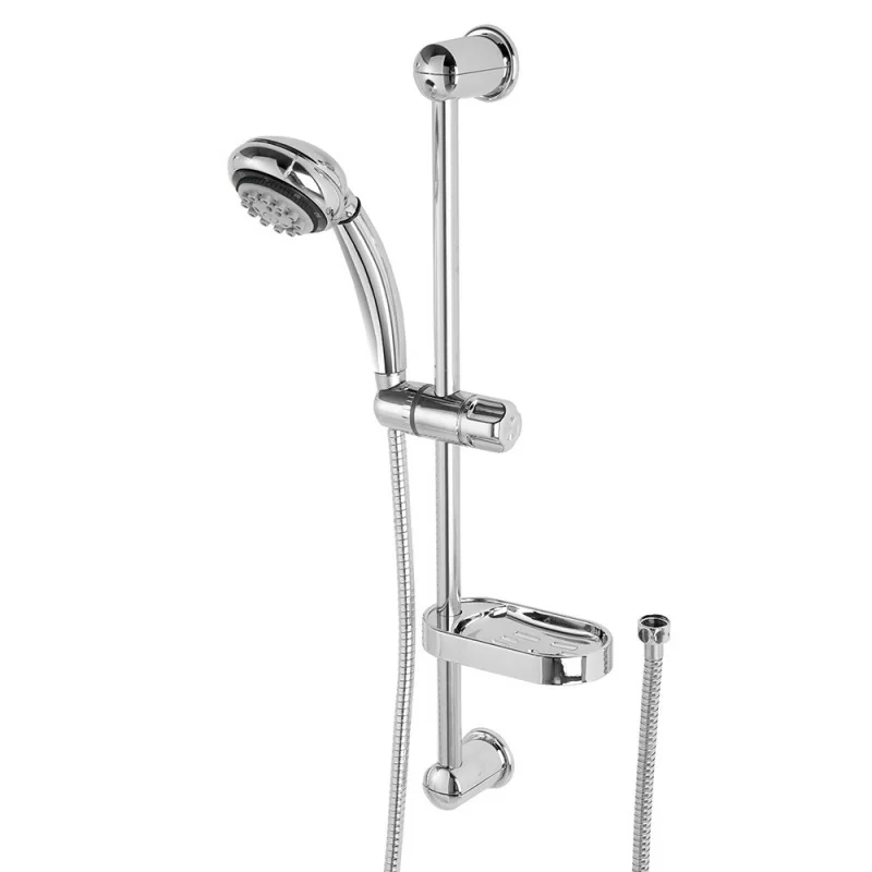 Il pratico saliscendi doccia è fornito di doccetta multifunzione con otto getti ed è realizzato in pastica dalla finitura cromata,così come l’utilissima mensoletta portasapone,inclusa nella confezione.