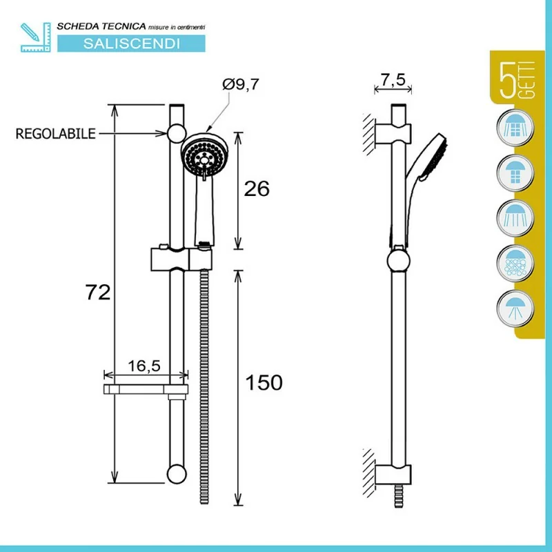 Scheda tecnica saliscendi per doccia con doccetta 5 funzioni e portasapone