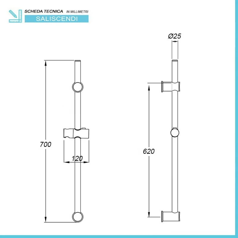 Asta per saliscendi doccia - in acciaio cromato con supporti regolabili