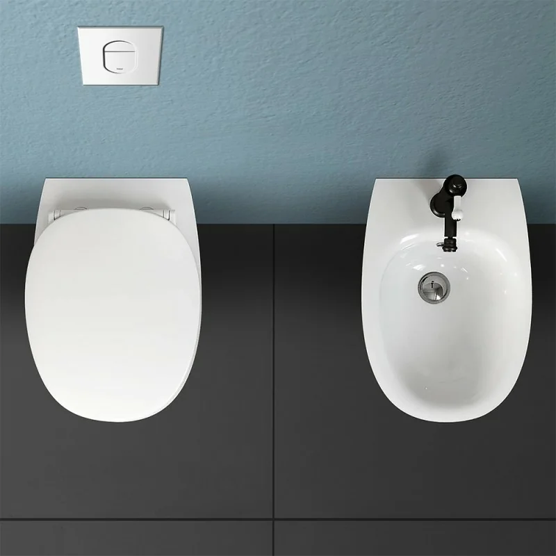 Coppia sanitari filomuro Morning WC rimless + bidet + copriwc rallenty