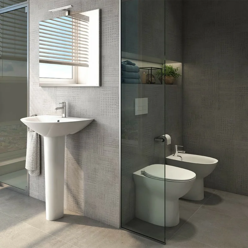 Realizzato in ceramica con elegante finitura bianco lucido,il set di sanitari Morning ha installazione filo parete,wc con sistema innovativo Rimless e scarico universale,a parete o a pavimento. Il set include bidet monoforo e sedile originale modello slim con chiusura soft-close.
