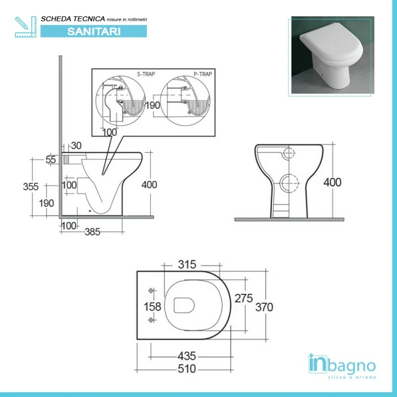 • Tipologia:Set di sanitari filomuro completi di copriwc;