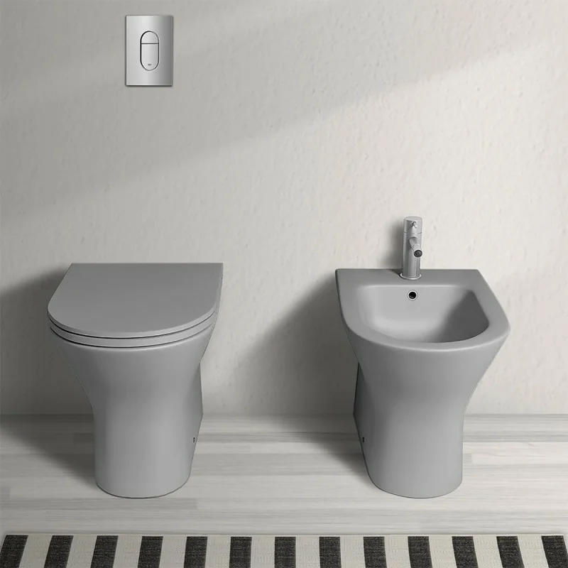 Coppia sanitari filo muro serie Feeling senza brida in ceramica grigia opaca con sedile copri wc a chiusura rallentata softclose