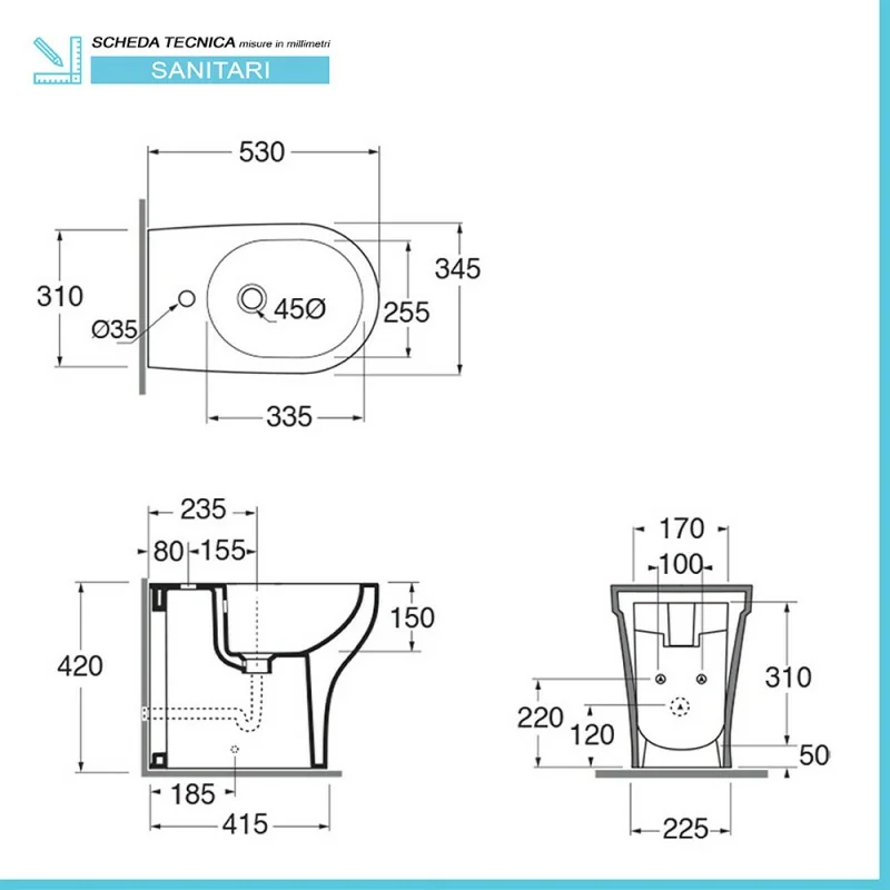 • Dimensioni bidet: L 34,5 x P 53 x H 42 cm;