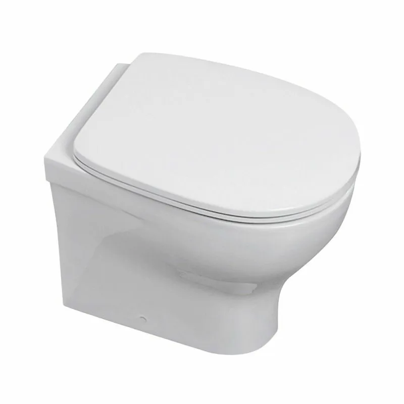 Set sanitari filo muro con scarico traslato senza brida Azzurra serie Pratica in ceramica bianca lucida completo di copriwc dedicato