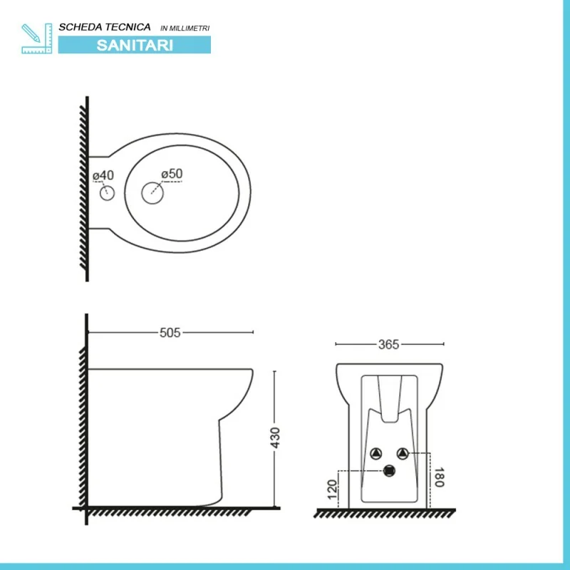• Dimensioni bidet:L 36,5 x P 50,5 x H 43 cm;
