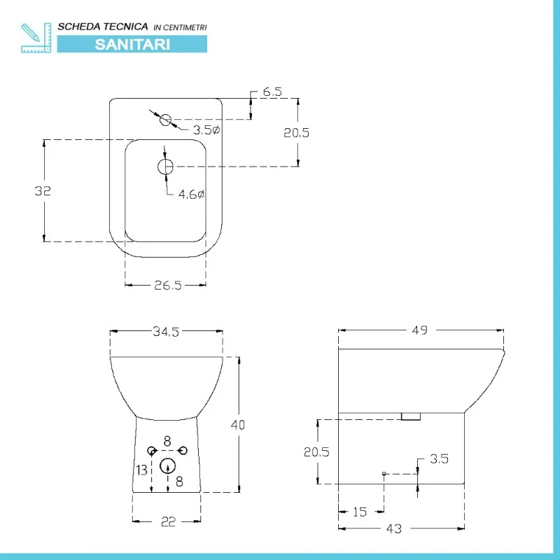 • Dimensioni bidet:L 34,5 x p 49 x H 40 cm;