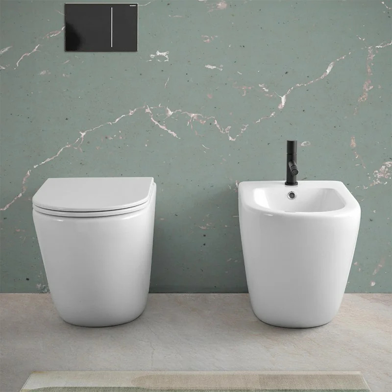 Wc e bidet in ceramica lucida con installazione filo parete e scarico universale a parete o a pavimento