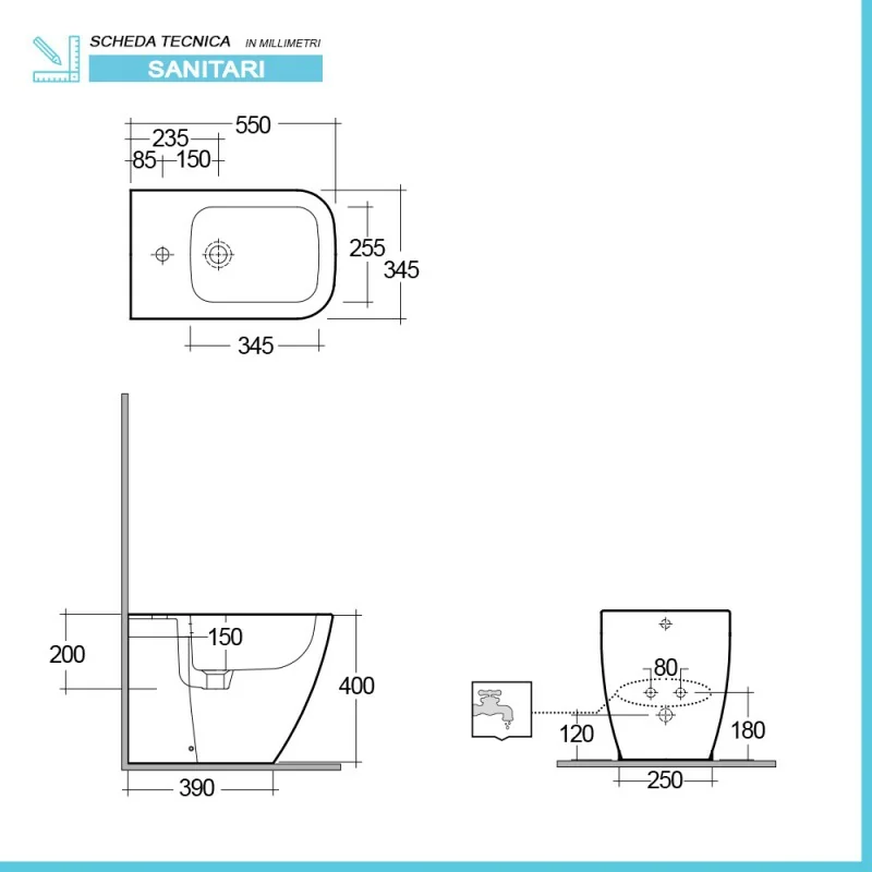 • Dimensioni bidet:L 34,5 x p 55 x H 40 cm;