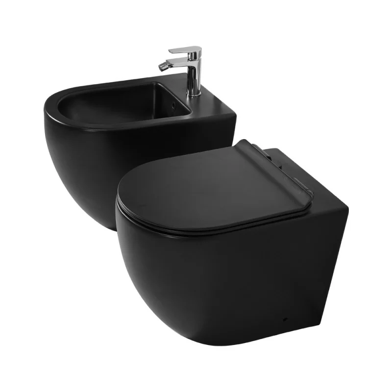 Coppia di sanitari filomuro in ceramica nera opaca con sedile e scarico a tornado Linea Tokyo
