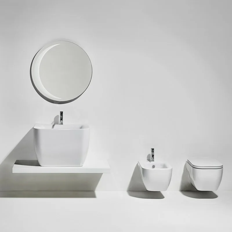 Progettato in ceramica di  alta qualità  con finitura bianco lucido, il set di sanitari sospesi include wc con  scarico a parete, bidet forato per rubinetteria e troppo pieno e  copriwater originale  modello slim con cerniere in acciaio a chiusura rallentata.