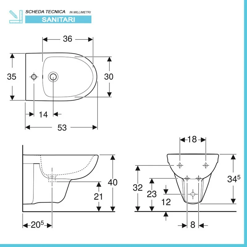 • Dimensioni bidet:L 35,6 x p 54 x H 35,5 cm;