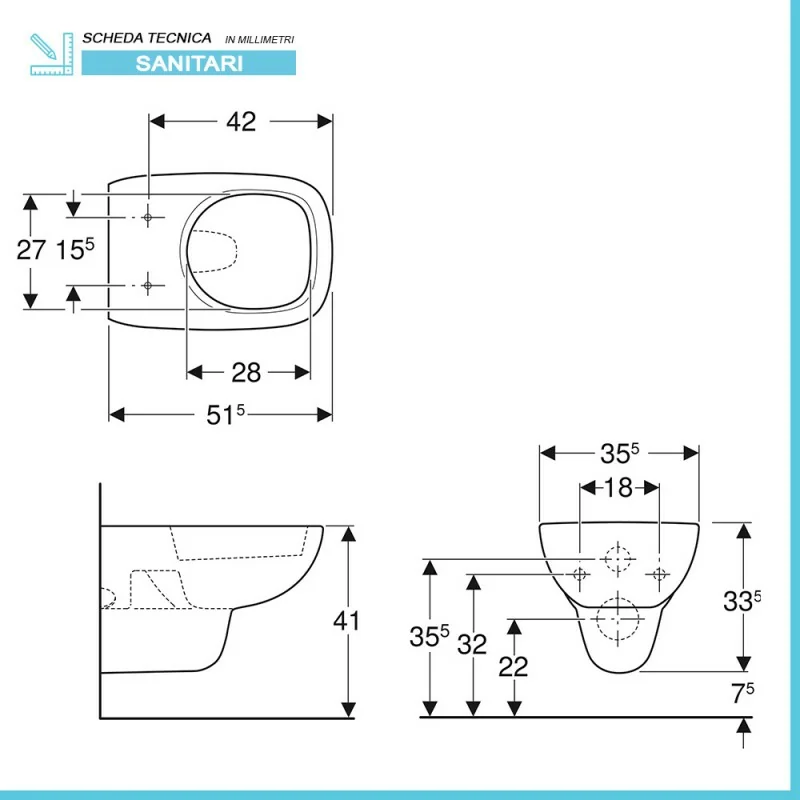 • Dimensioni wc:L 35,5 x p 51,5 x H 33,5 cm;