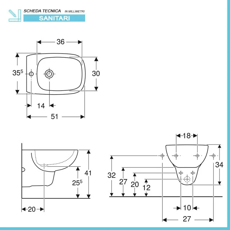 • Dimensioni bidet:L 35,5 x p 51 x H 34 cm;