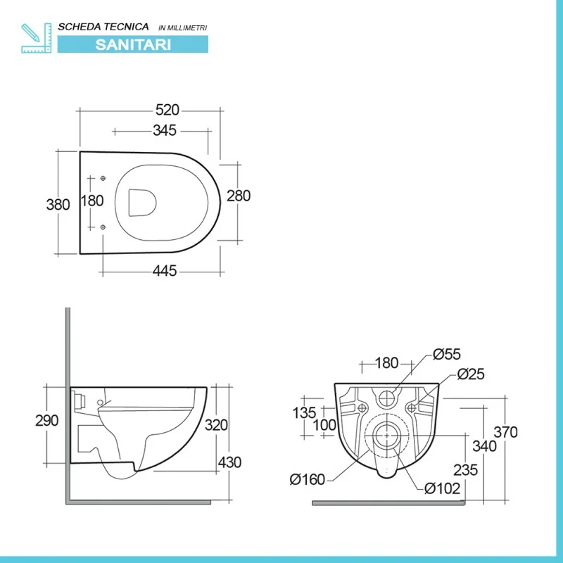 • Dimensioni wc:L 38 x p 52 x H 43 cm;