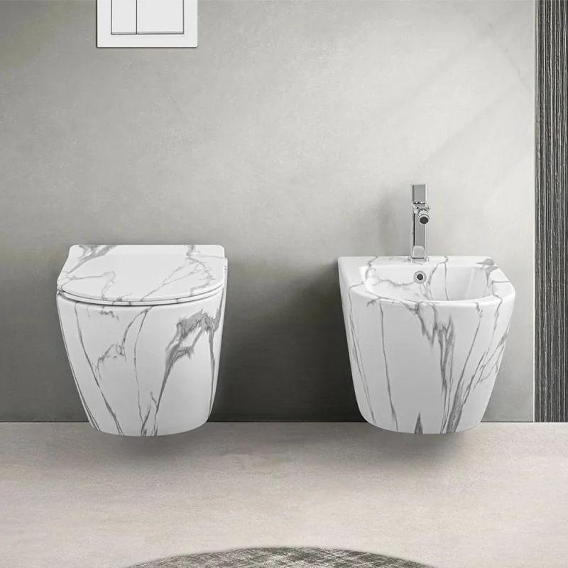 WC bidet e copriwater linea Tokyo sospesi in ceramica dall’effetto marmorizzato bianco