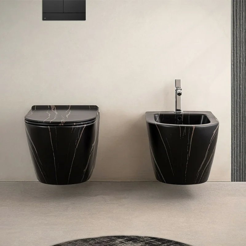 Set completo water bidet e copriwc linea Tokyo sospeso con ceramica dall’effetto marmorizzato nero