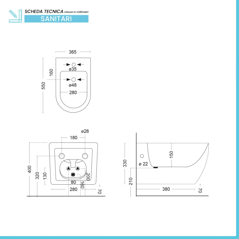 • Dimensioni bidet: L 36 x p 55 x H 41 cm;