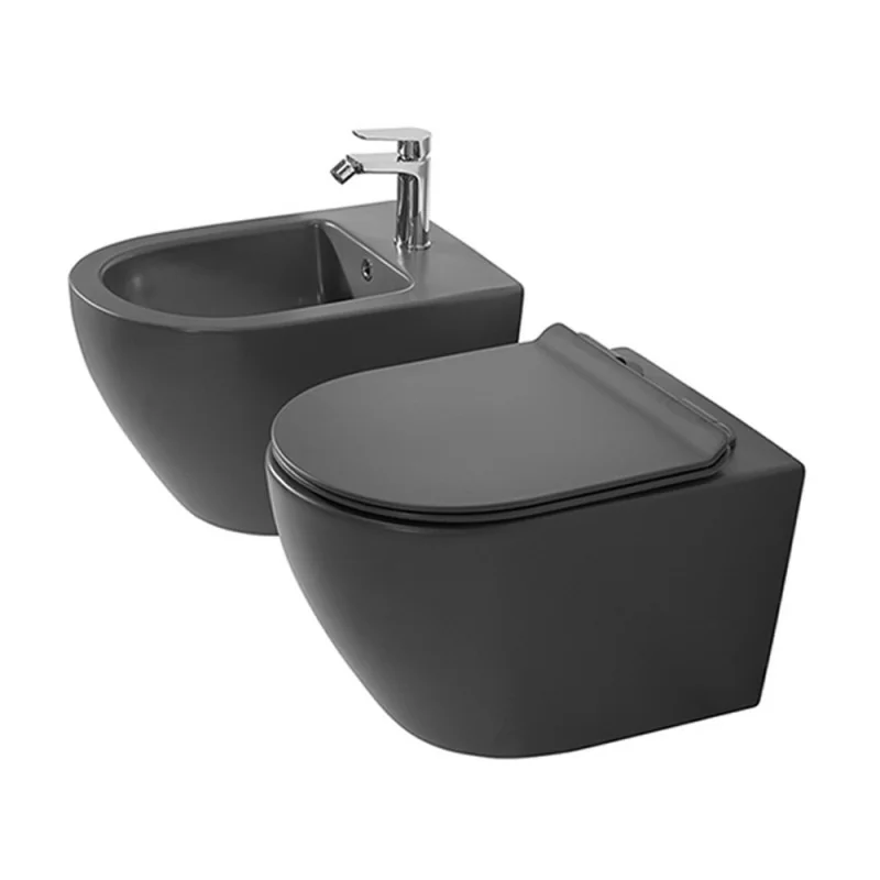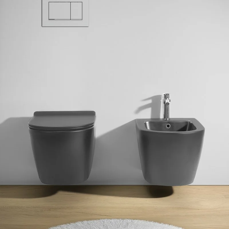 Coppia di sanitari sospesi in ceramica grigio opaca con sedile e scarico rimless Linea Tokyo