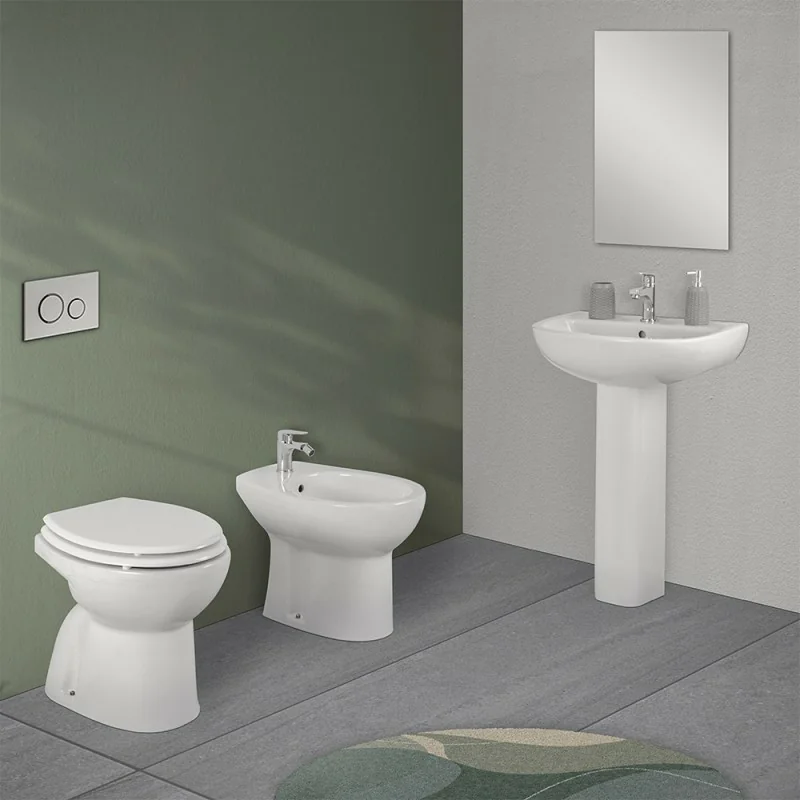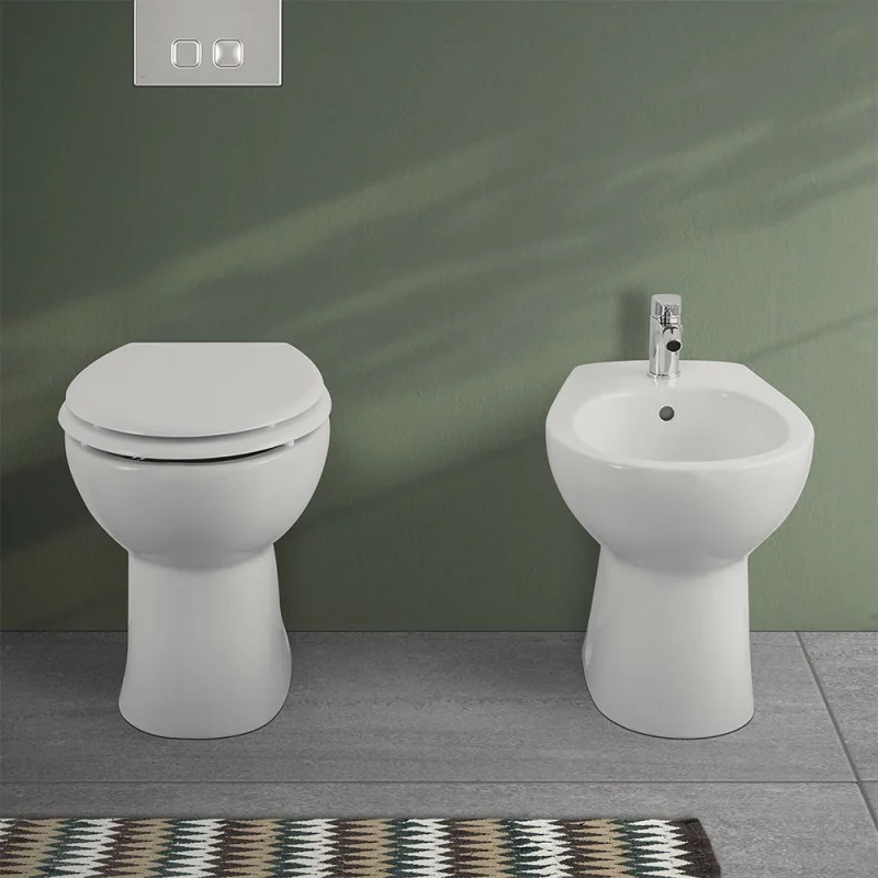 Il water è pratico e compatto,con una profondità di soli 54 cm. Realizzato in ceramica bianca lucida e con scarico a pavimento,ideale per installazioni su impianto con scarico a terra. Il bidet abbinato da 54 cm è provvisto di foro troppopieno e foro per miscelatore.